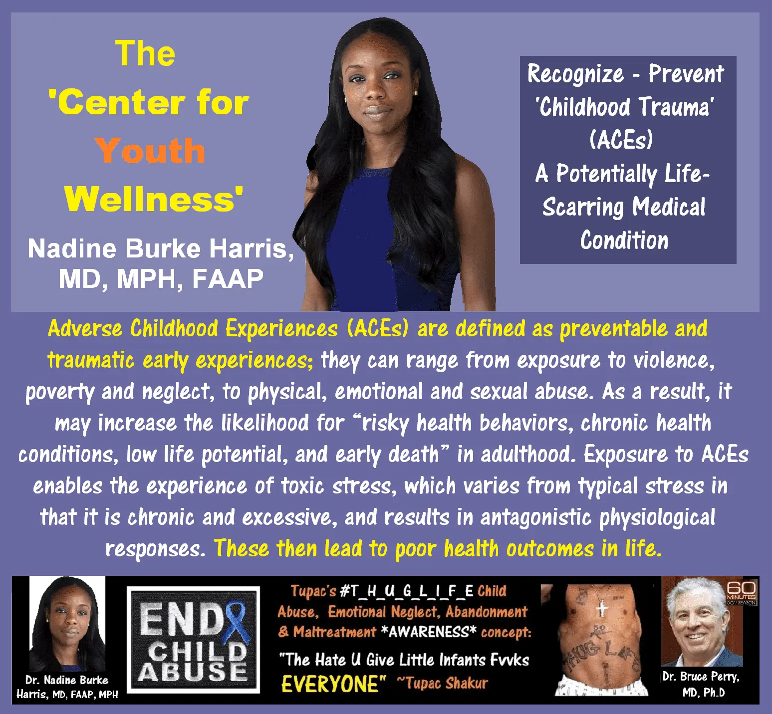 A *CHILD CARE* PUBLIC HEALTH CRISIS there is no denying is responsible for popular American urban story-TRUTH-tellers and 'Childhood Trauma' (#ACEs) victims the late Tupac Shakur (born 1971) and Mr. Barack "My Brother's Keeper" Obama White House guest and friend Kendrick Lamar (born 1987) vividly describing in their American art and interviews the "T.H.U.G.L.I.F.E." and "Good Kid, m.A.A.d. City" Child Abuse Cultures prevalent in far too many American communities.