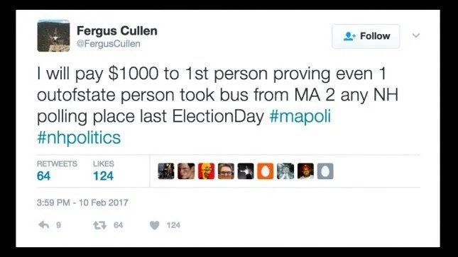Look, we all know there is no way Clinton could have gotten that many votes without voter fraud, so the question is not whether there was voter fraud or not, but how did the Clinton campaign get away with it?View attachment 112140 Of course Trump is lying. And Fergus Cullen is willing to bet money on it.