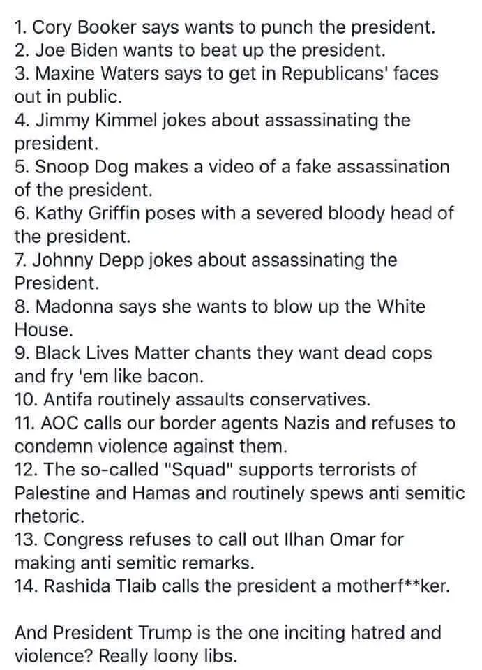 - Publicly declared an allegiance to Trump before committing or threatening violence against members of political or racial groups that Trump has denounced <<