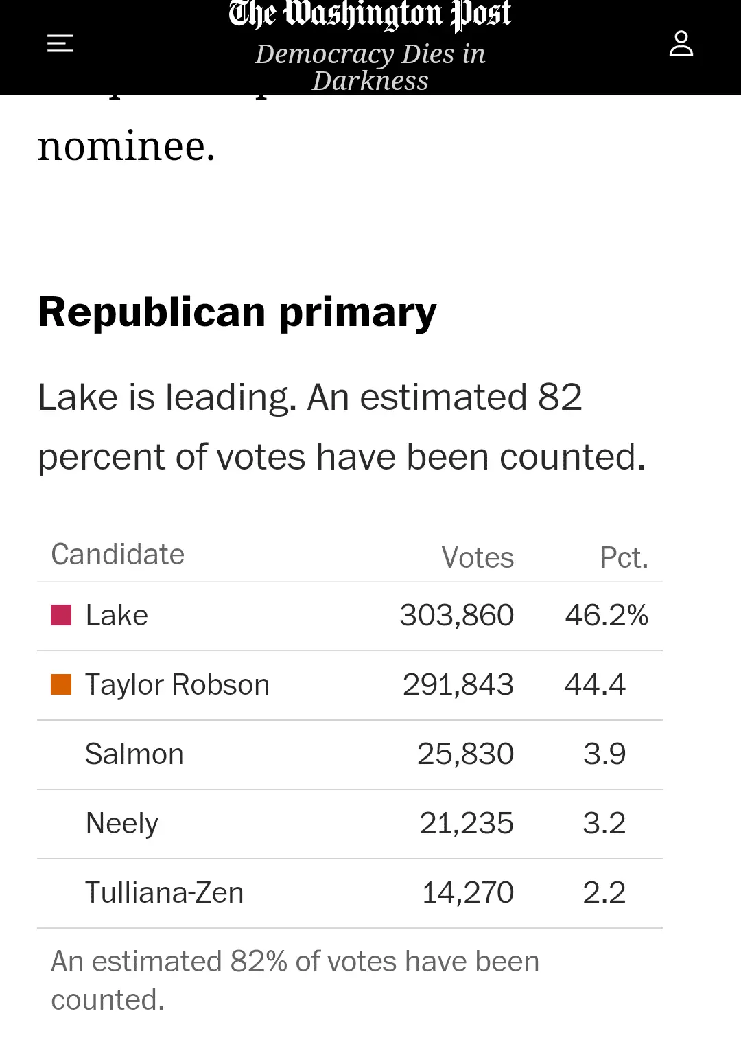 Weird, because Taylor Robinson was endorsed by the current Governor of Arizona. I suspect if there is cheating...it's cheating against Lake...not for her.Lake is making sure she has enough votes to avoid the runoff and audit. They’re cheating as fast as they can.