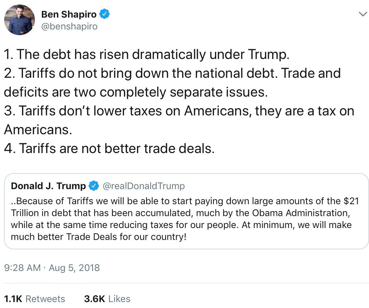 Unless of course you are considering the entire American economy and assume that the tarriffs will result in more US businesses/jobs and/or better trade deals which will result in a higher GDP, increasing revenues and going towards our national debt. We need to get our GDP to debt ratio down bigly
