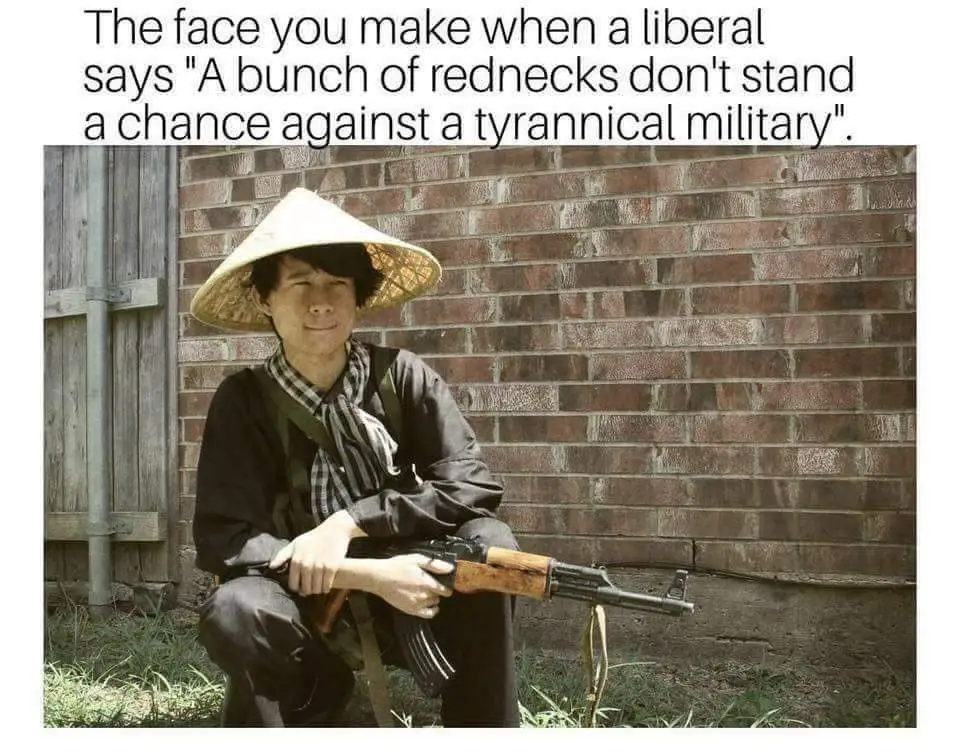 They had many of the weapons you say will make defeating them impossible, yet they defeated them....Ditto the Afghans against not one, but two "superpowers".Oh, you got that little picture over the internet. You do understand you can be tracked anywhere with a court order if your cell phone is turned on. Now tell us how you can getaway with anything without a cell phone or access to your HEALTH INSURANCE or your income is stopped.