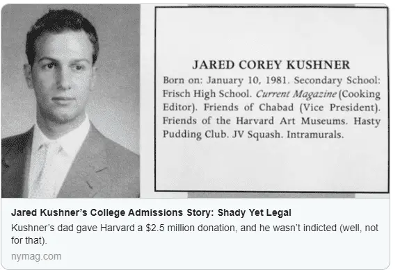 Jared Kushner son-in-law of Donald Trump, husband of Ivanka Trump, and son of Charles Kushner was accepted into Harvard shortly after his father pledged $2.5 million to the school.