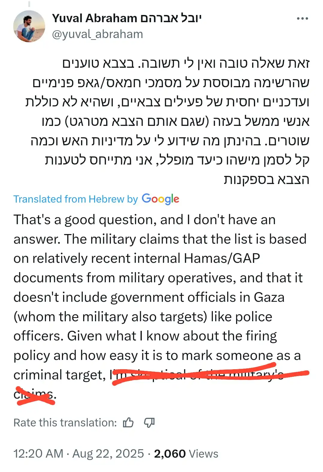 And this the origin of the claim. It's self hating militant Yuval Abraham. Of course, sneaky Yuval won't post the following tweet in English. But I translated it via Google: (GAP refers to Palestinian Islamic Jihad - PIJ). Though he refuses to "believe" but it's also not journalism to omit it.