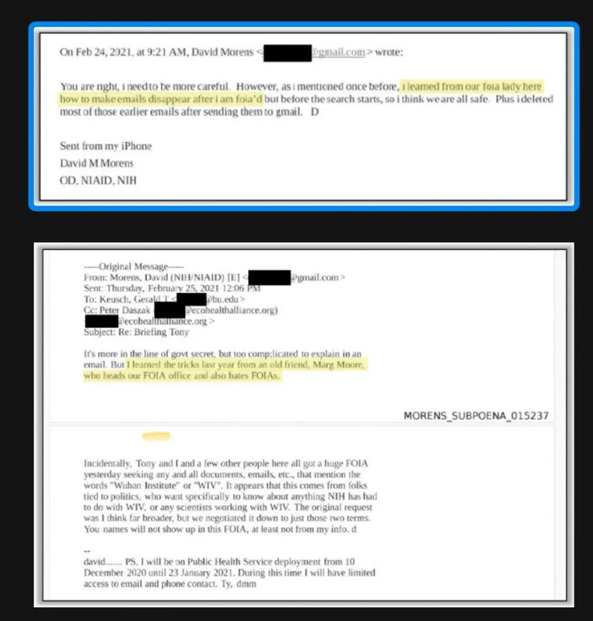 “As you know, I try to always communicate on gmail because my NIH email is FOIA’d constantly,” wrote David M. Morens, a high-ranking NIH official, in a September 2021 email, one of a series of email exchanges that included many leading scientists involved in the bitter Covid origins debate. “Stuff sent to my gmail gets to my phone,” he added, “but not my NIH computer.