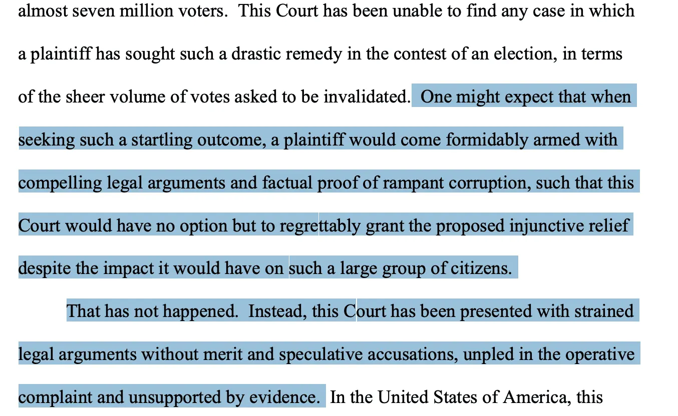 “In the United States of America, this cannot justify the disenfranchisement of a single voter, let alone all the voters of its sixth most populated state,” wrote Judge Brann, an Obama appointee who has been a member of the Federalist Society, a conservative legal group.