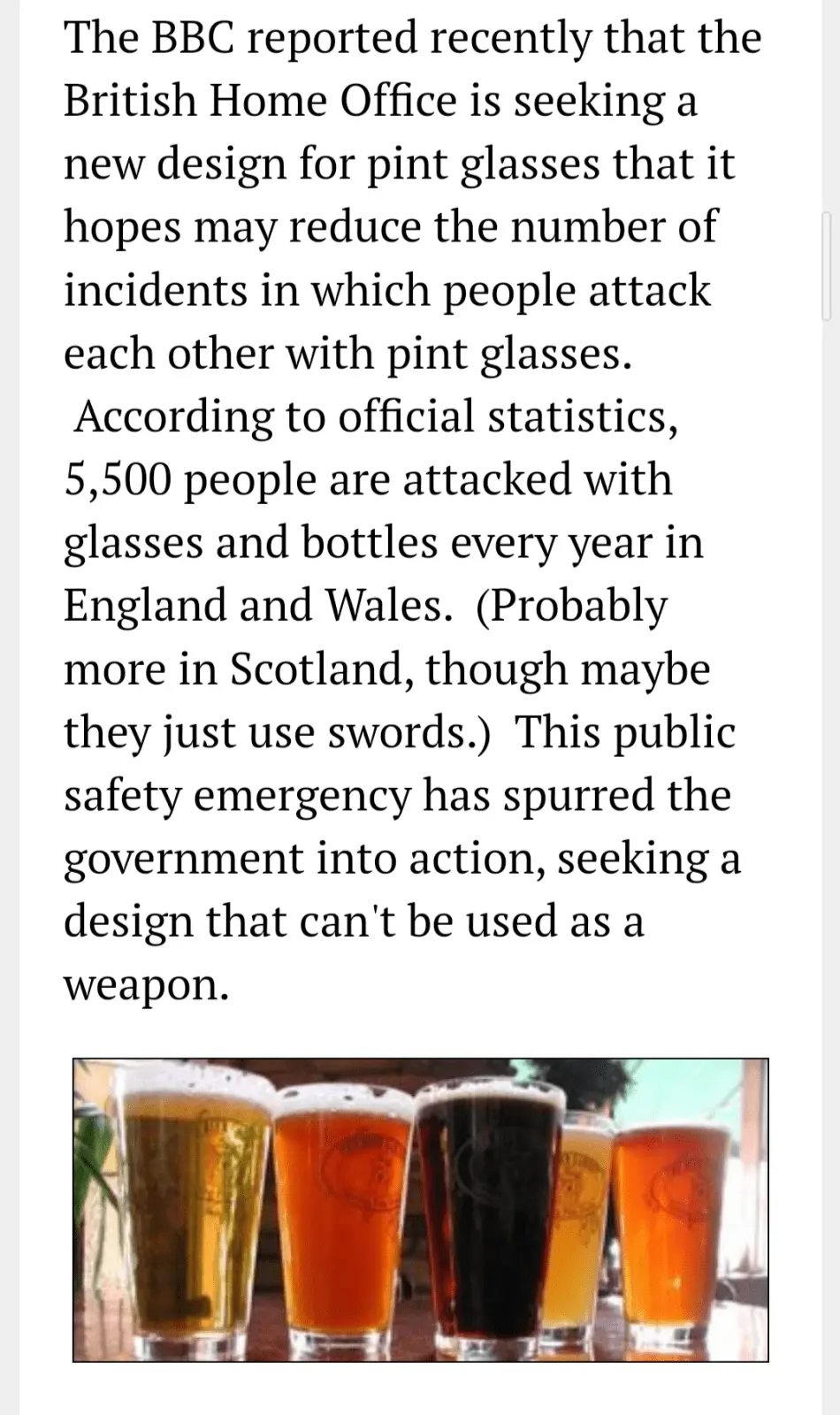 Actually that article is a lie. They have proposed new measures similar to Australia. Somewhere between a pint and a half to geve people more options and reduce the amount of consumption. Alcoho;ism being a major health issue.Pint glass control...