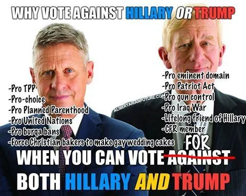 Trump is a corrupt piece of shit who represents everything wrong with the GOP. He is literally no different from Hillary, which is why they are friends. The narrative that "Trump is better" is simply untrueTrump and his supporters are the ones getting Hillary elected.Johnson has zero chance of winning, but a great chance of getting Hillary elected.