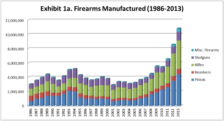 More than 4.4 million handguns were manufactured on U.S. soil in 2013.