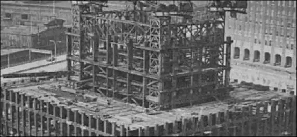 what is seen does not match the plans in anyway. The plans show an elevator, an air shaft or a steam shaft where we see the massive core base wall so large it has a 3x7 utility hallway running the length of it that was used to connect plumbing cast into the core wall as a space saving, strengthening measure.