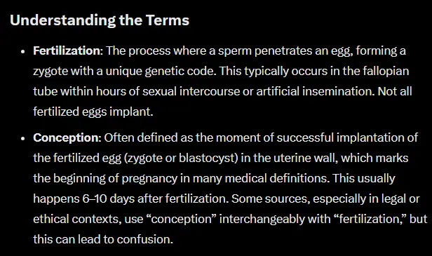 According to AI and the sources that AI insists are credible, "conception" is the very same thing as "implantation."(when the blastocyst/ zygote attaches to the uterine wall.)