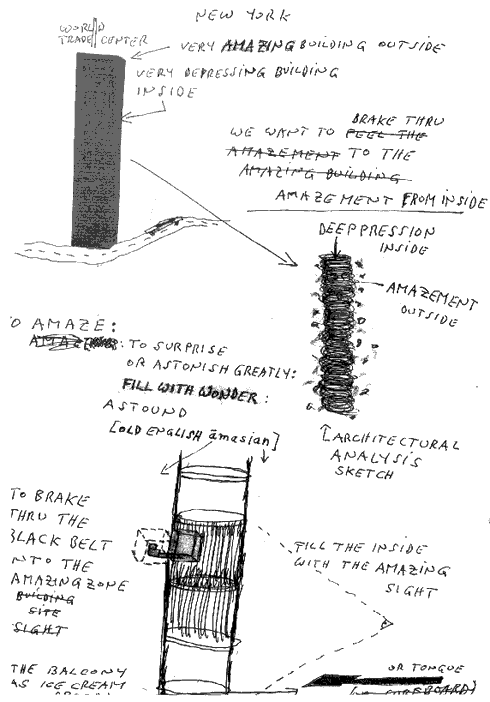 Next to one falling creature were the hand-written words “”300 meters of pure pleasure.” In another sketch in the book one of the towers seems to have fleas jumping off it with the caption “Amazement Outside, Depression Inside.”