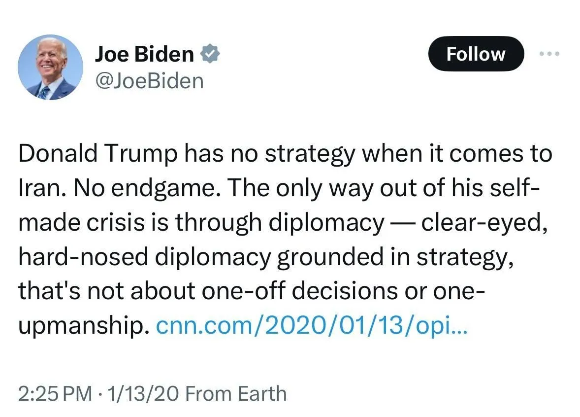 Joe Biden warned America before the 2020 election that Trump "is going to get us to war in Iran."