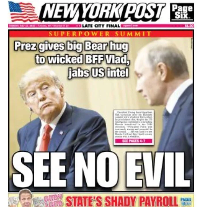 In the US, several papers went in hard on Trump. The New York Daily News accused the president of treason. Its front page featured an illustration of Trump holding hands with a bare-chested Putin and shooting Uncle Sam in the head with a gun in the other hand.