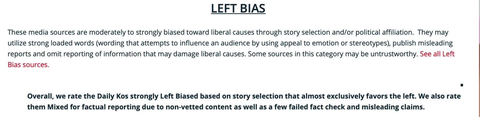Overall, we rate the Daily Kos strongly Left Biased based on story selection that almost exclusively favors the left. We also rate them Mixed for factual reporting due to non-vetted content as well as a few failed fact check and misleading claims.