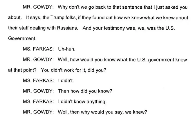 He said members of the Obama administration were interviewed under oath and said they had no evidence of a connection between the Trump campaign and the Russian government, despite going on national television and telling the American people that “there were all sorts of evidence that linked the two things.”