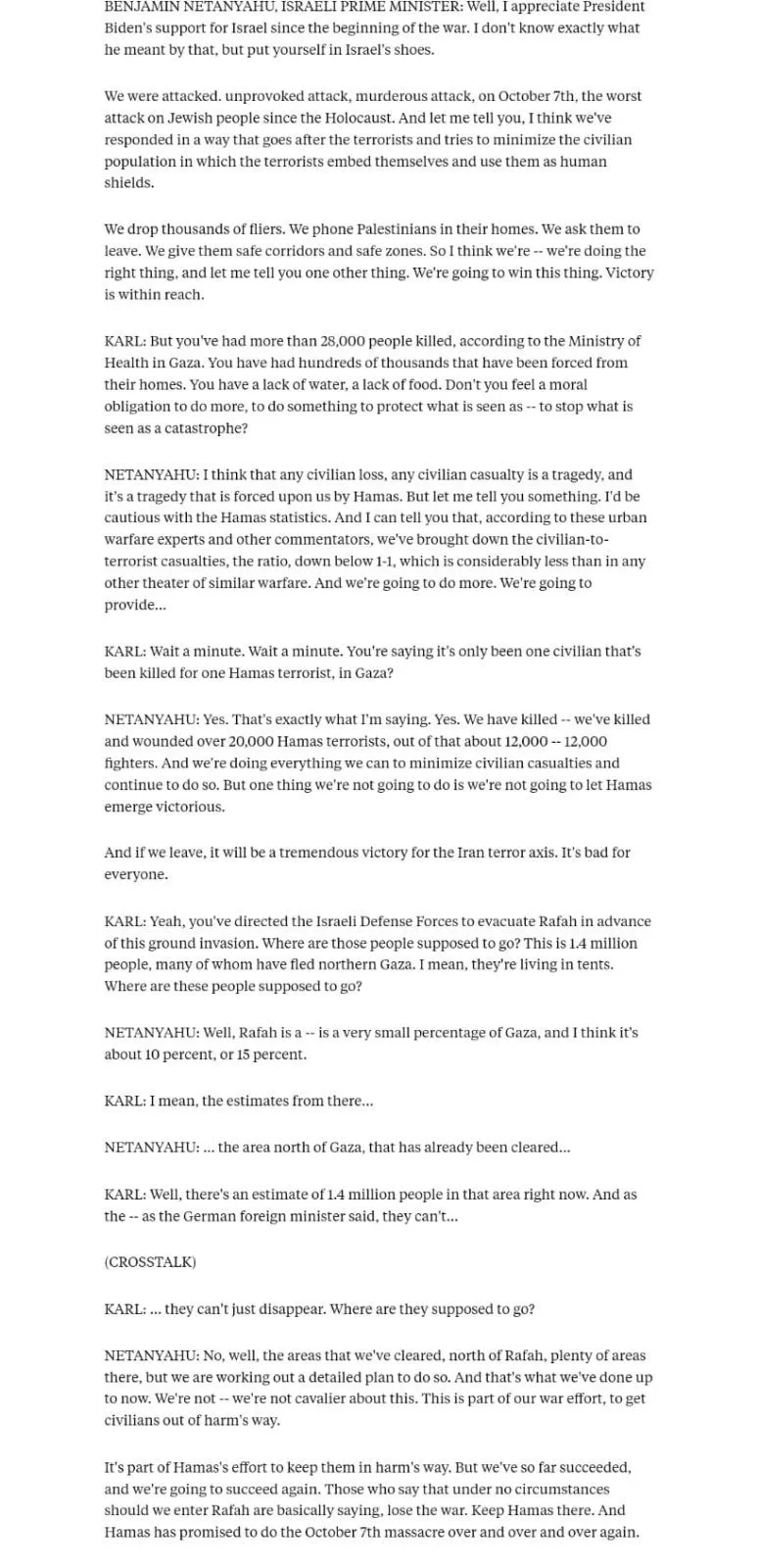 KARL: Yeah, you've directed the Israeli Defense Forces to evacuate Rafah in advance of this ground invasion. Where are those people supposed to go? This is 1.4 million people, many of whom have fled northern Gaza. I mean, they're living in tents. Where are these people supposed to go?