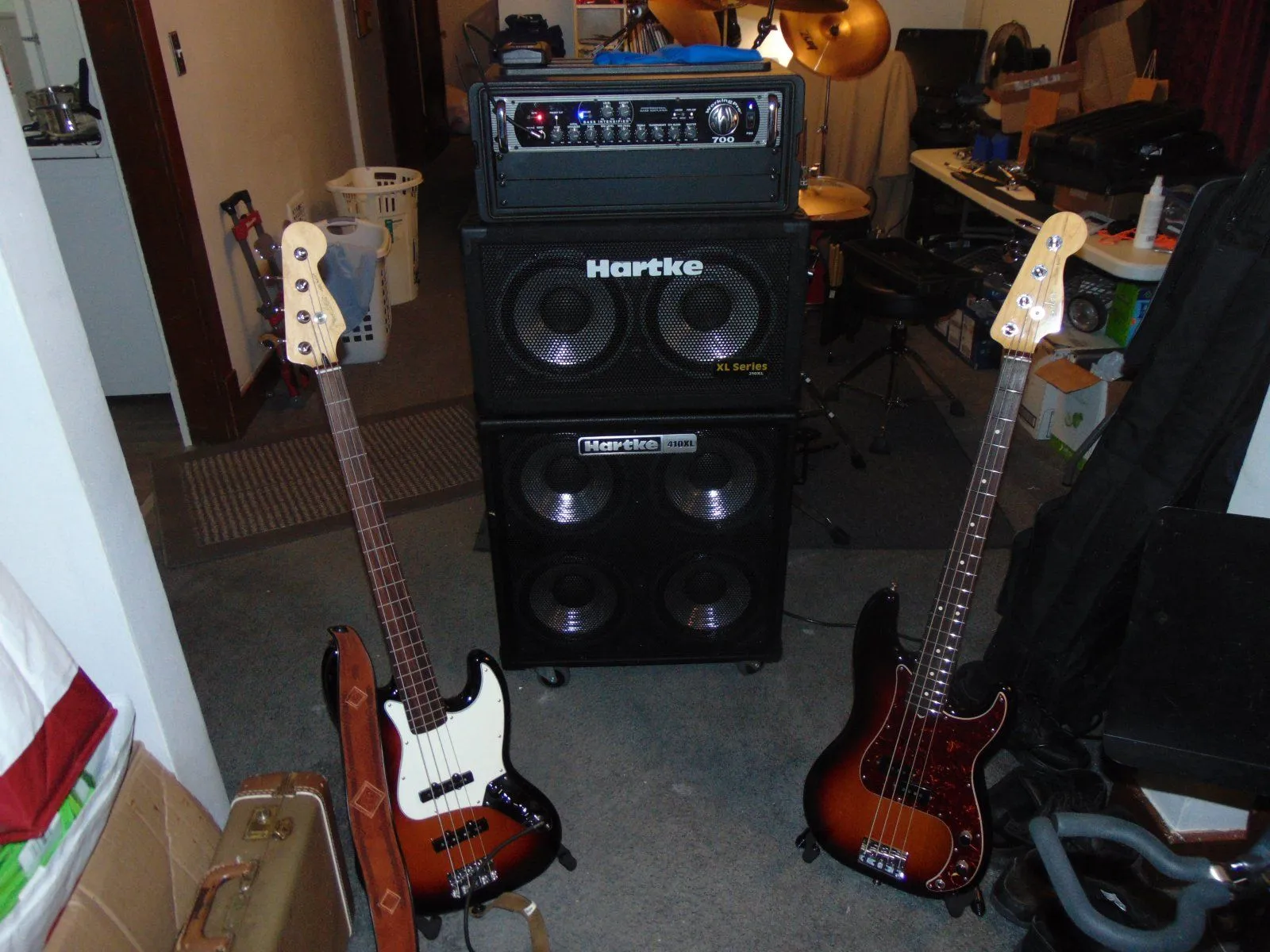 Back in the 60s, I heard a Navy band that included a phenomenal bass player who could get unique (essentially indescribable) sounds from his bass guitar by rapidly picking and slapping the guitar. They were playing on top of a flattop river barge anchored as a stage at our city waterfront.View attachment 479686Are Bassists allowed? Here's my rig and two ladies. From left is a 2018 Fender Player Series fretless Jazz Bass, center (up to down) Line6 G30 wireless, SWR WorkingPro 700, and Hartke XL bass cabs, 210 and 410, respectively. Right of that is my main player, my 2011 60th Anniversary Fender American Standard Precision Bass. Since the 2010 year and until the American Pro came out, Fender dropped the Custom Shop 62s in these basses. I string both my basses with D'Addario XL 165 Nickels (.045-.105)