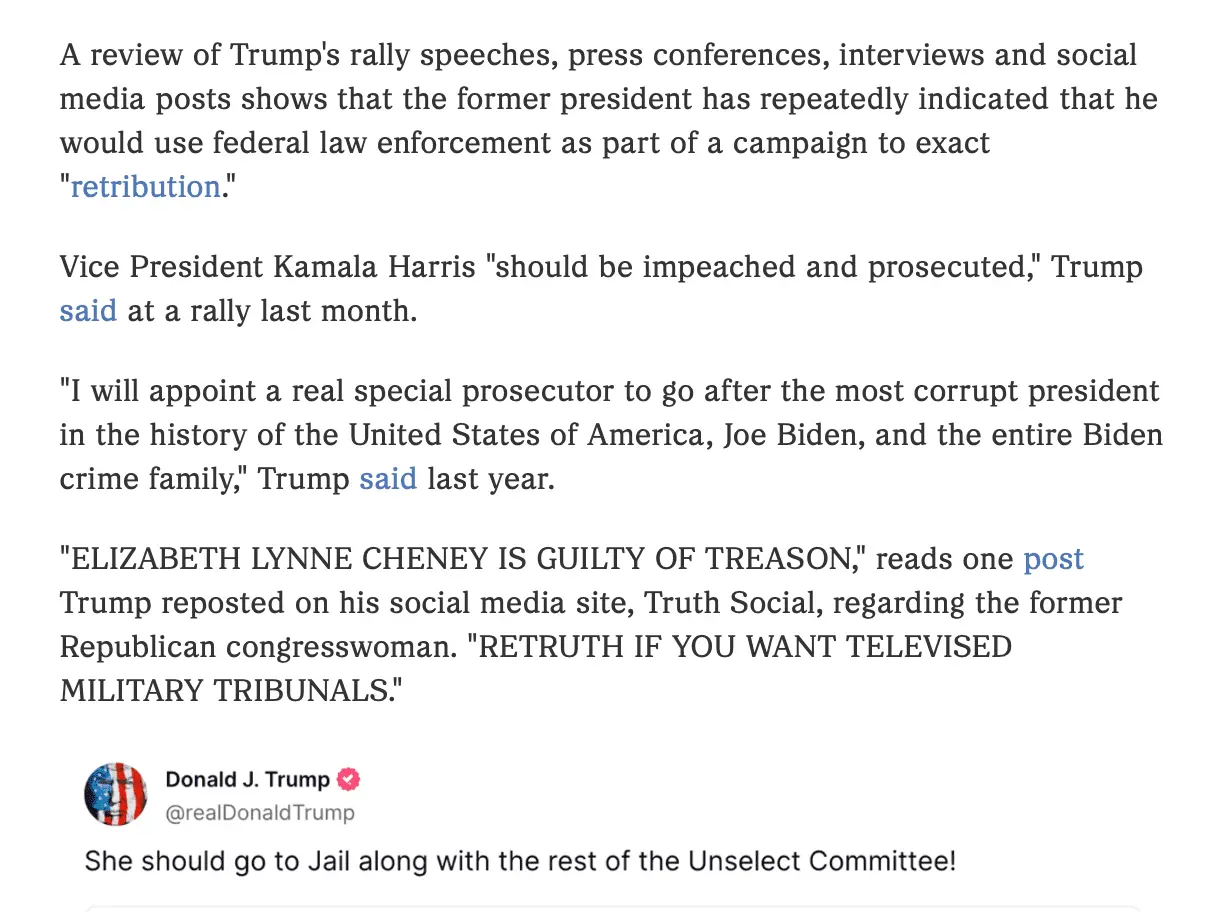 Subsequently he has said he wants the weaponization of government against political opposition to stop. He does not want revenge for what has been done to him, but he won't stop his DOJ for going after people who have committed actual crimes. ACTUAL crimes and not made up crimes or maybe crimes. ACTUAL crimes.