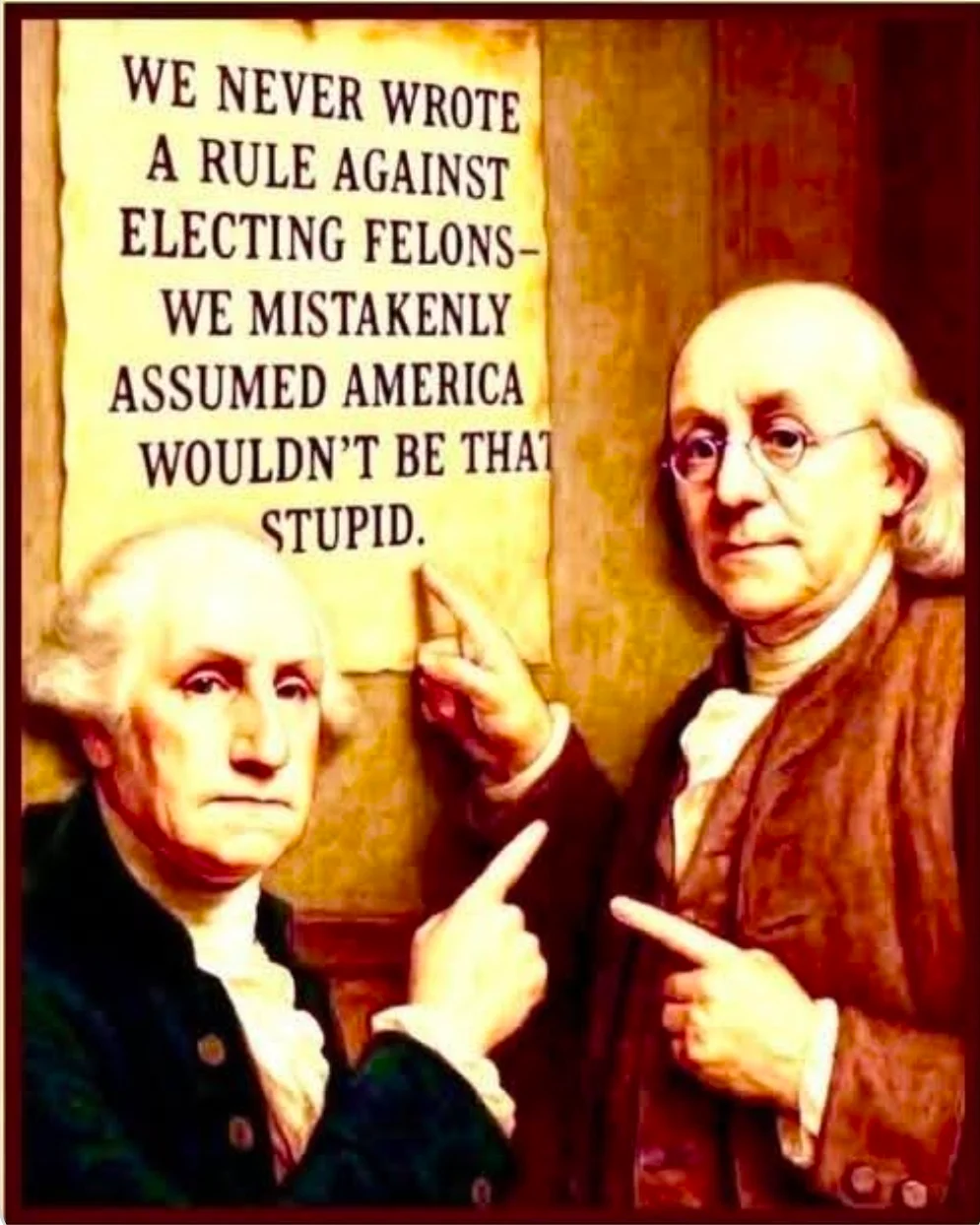 Really? Aren't these the same founders who owned slaves. I am glad you agree the founders didn't see idiots like you who would vote for a 34-count felon.The founders never expected demafasict and the need for America’s Mandela