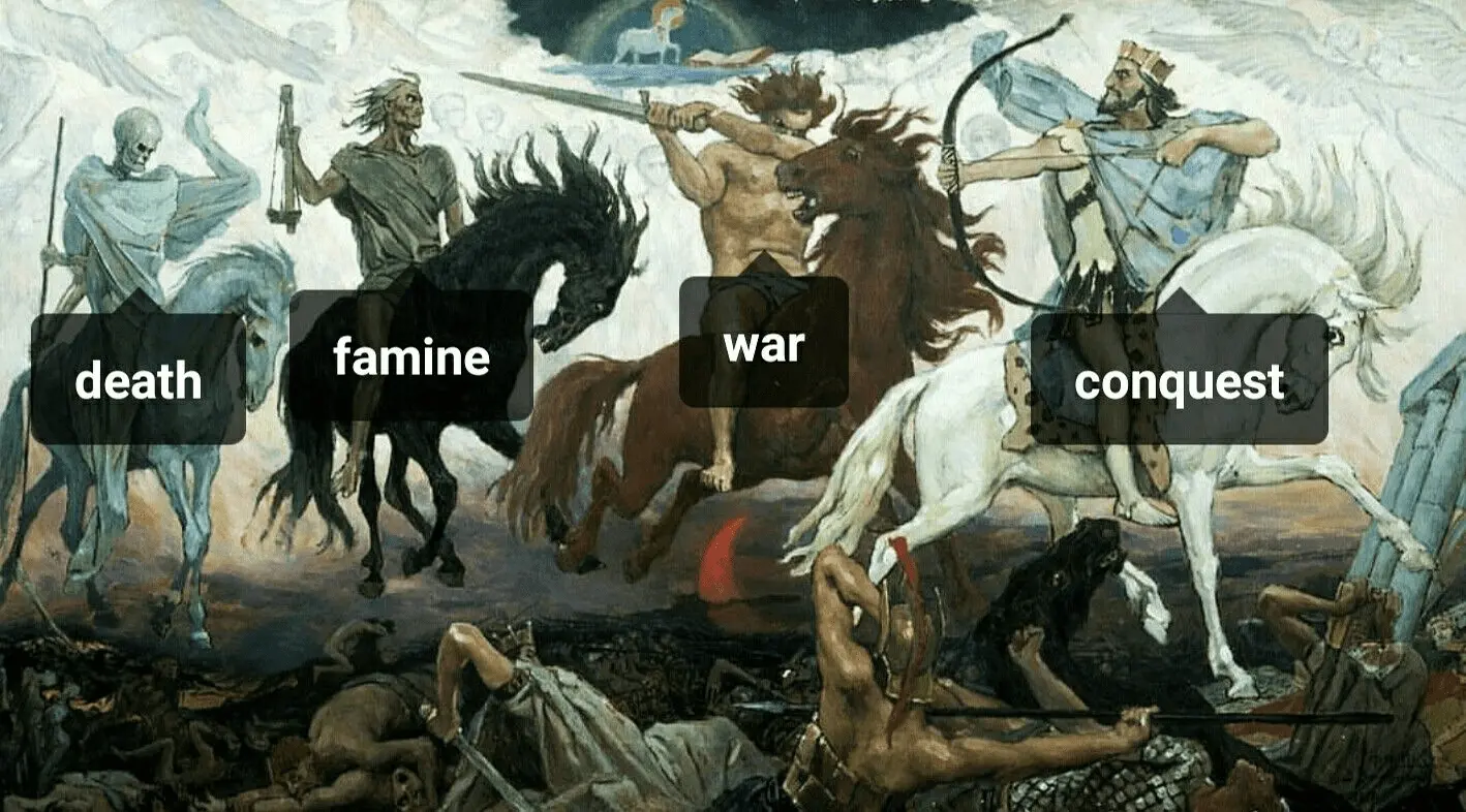 "I concur", said the Horseman of Famine, "Let's go back home cuz I'm as hungry as hell!" as they all galloped back home laughing hysterically.