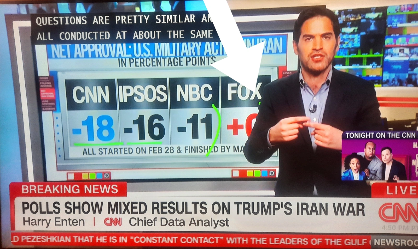 Okay, this is the net approval rating. That's the approval rating minus the disapproval rating. And this is the net approval rating for US military action in Iran. Look at this. CNN, our own CNN poll shows that the net approval rating is minus 18 points.