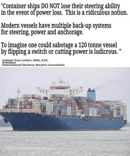 Kind of explains why tug guidance is needed until get pass vital infrastructure such as bridges and such.Anything can happen in an engine room. Fuel pump trips. Energency trips hit, oveeheat, low oil pressure, bad governor, inrush current takes out main power.