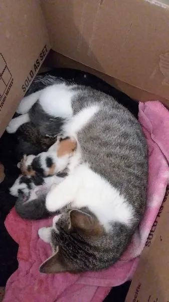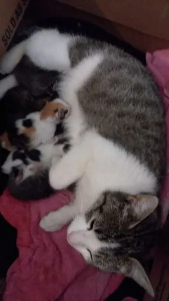 That's a cute cat and her babies. One of the babies is what I call a "cow kitty", it has the markings of a cow. I and my family when I was a kid, always had good luck with them. They were all sweet and affectionate. Unfortunately, I can't take any of the kittens because we already have two grown cats, and they're all we have the room for and can afford to have right now. Good luck!If you come and pick em up there yours.....free