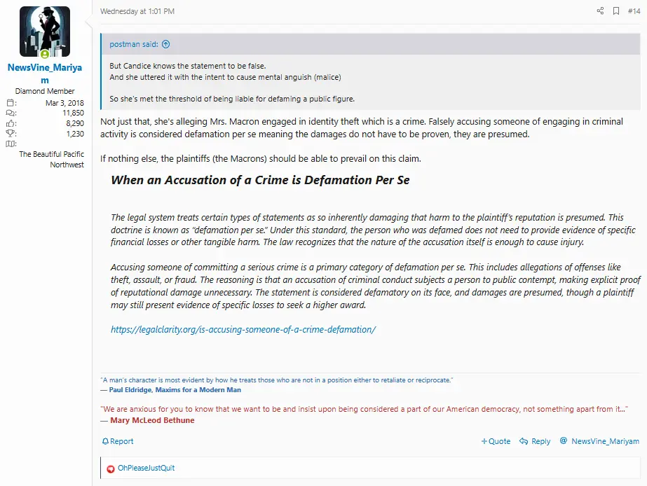 She also has a bigger pecker, than your's.Unless it is libel or slander. Which in the case of Macron's wife and Obama's wife, it most certainly is.
