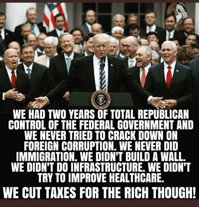 In 2017 Trump was president, Mitch McConnell was the Senate Majority Leader & Paul Ryan was the Speaker. The Republican Party had MAJORITIES in BOTH the House and the Senate. They FAILED on infrastructure, healthcare, and the wall. They DID pass tax cuts for the top 1%. Get it?