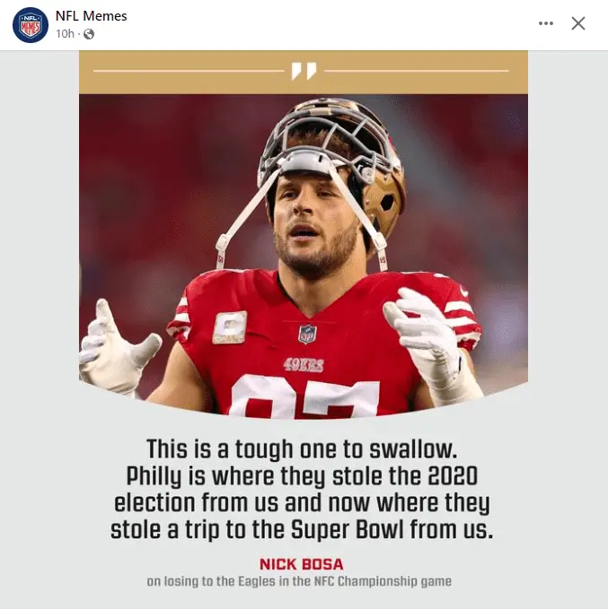 Facts never stand in the OP's way. Here's a story he'll likely be posting next:Nick Bosa never said that ... it was his brother, Joey Bosa, and it was a homophobic slur he yelled at an Eagles fan ...