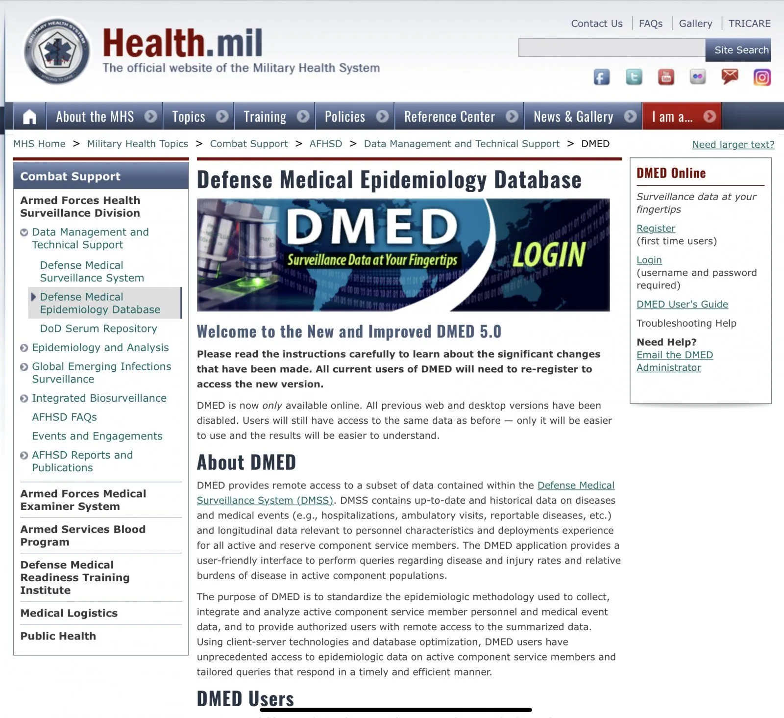 DMED provides remote access to a subset of data contained within the Defense Medical Surveillance System (DMSS). DMSS contains up-to-date and historical data on diseases and medical events (e.g., hospitalizations, ambulatory visits, reportable diseases, etc.) and longitudinal data relevant to...