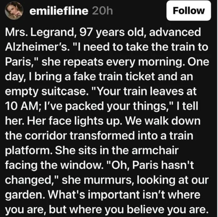Had an experience like this with my charming mother-in-law. There we were in the care facility in Seattle, while in her world, we were on a train going to Utah. It was pleasant for me to learn to speak to her in HER world, not in mine.