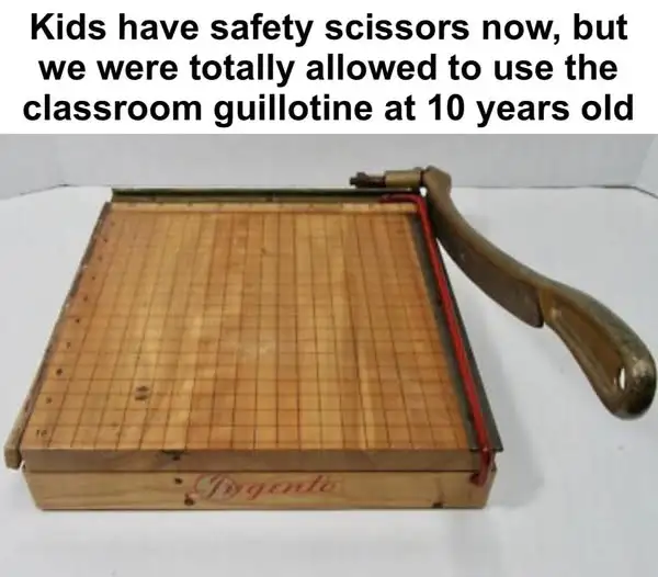 Ours didn't have the red safety rail. I still remember the swats when I got caught talking a kid into laying his head onto it.no kidding, shocked some classmate did not lose a finger or two