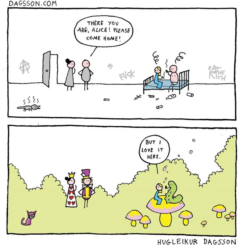 It's "Alice in Wonderland." Everything looks crazy because she's high. lol