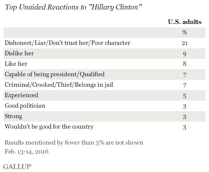 Fifty-one percent of voters had a negative reaction to Clinton, in keeping with Gallup’s tracking of her overall unfavorability rating. Forty percent of initial reactions to Clinton are negative, ranging from “liar” to “thief”:
