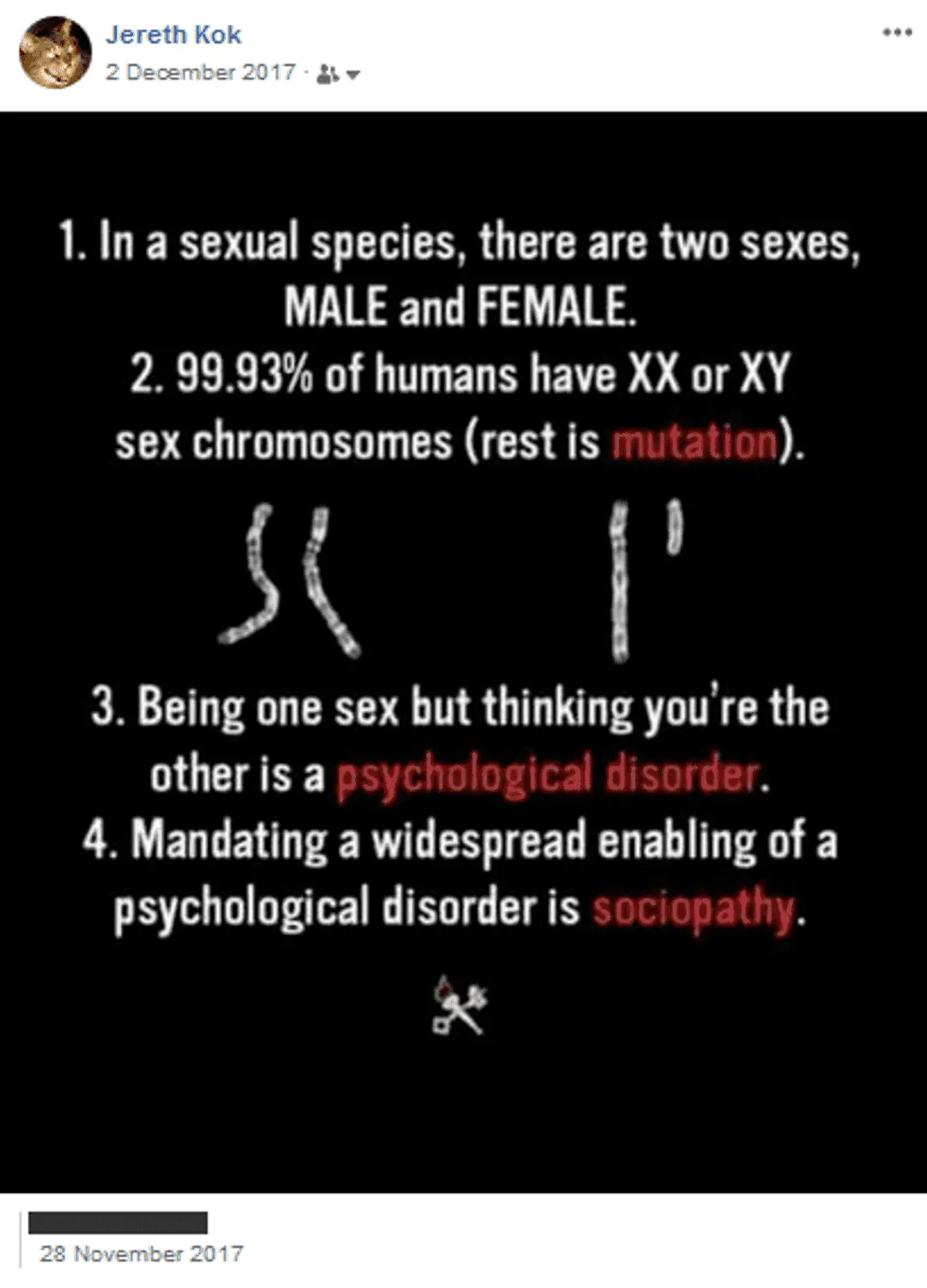 Not only are gender and biological sex separate things, biological sex isn't even binary. There are intersexed individuals with multiple X or Y chromosomes who are born with varying degrees of both male and female sex organs.