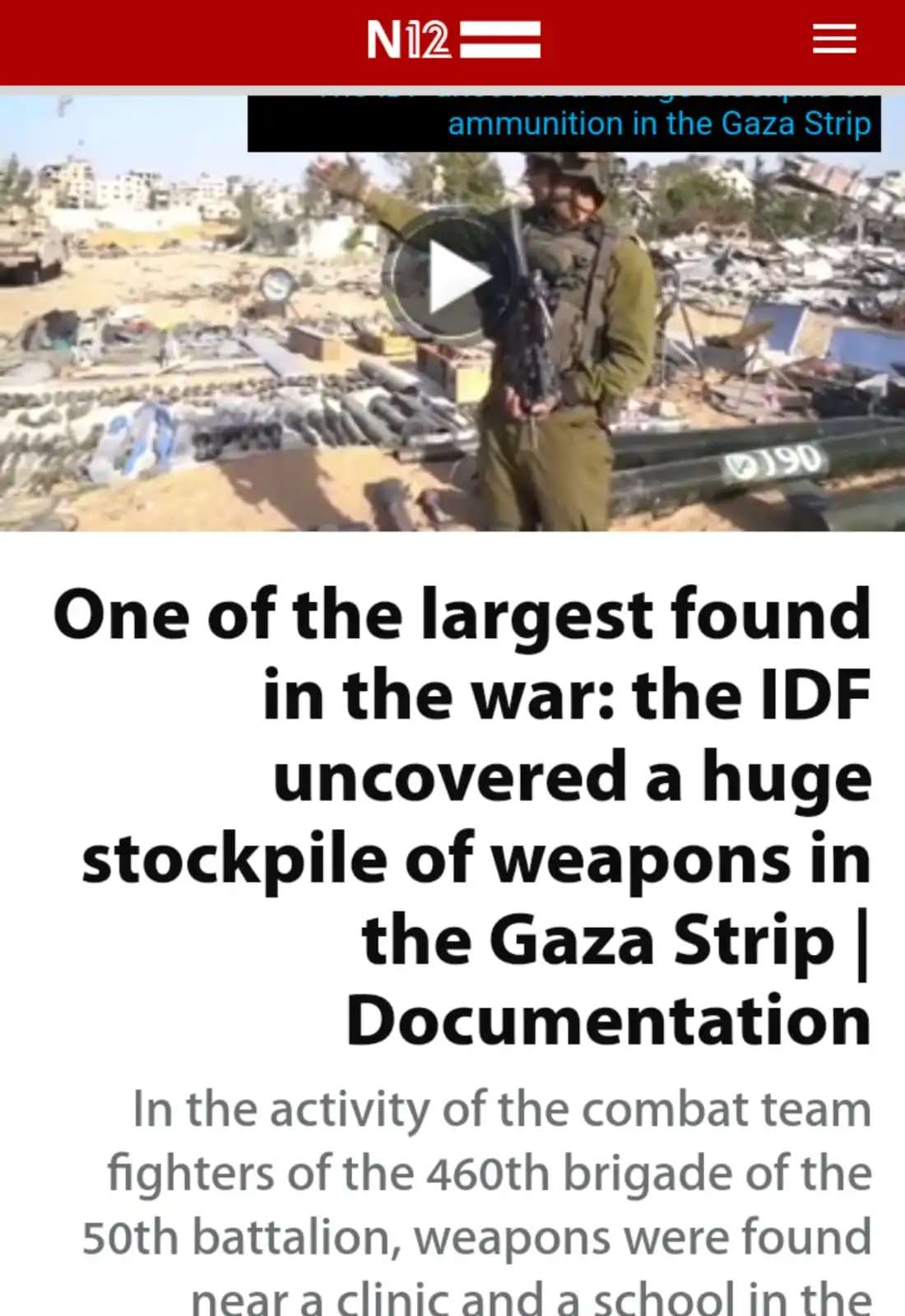 In the activity of the combat team fighters of the 460th brigade of the 50th battalion, weapons were found near a clinic and a school in the northern Gaza Strip • The IDF spokeswoman stated that the stockpile contained hundreds of rockets and RPG launchers, dozens of anti-tank missiles, dozens of explosive charges, long-range missiles, dozens of grenades and unmanned aerial vehicles • The IDF added: This is further proof of Hamas's cynical use of the residents of the Gaza Strip as a human shield.