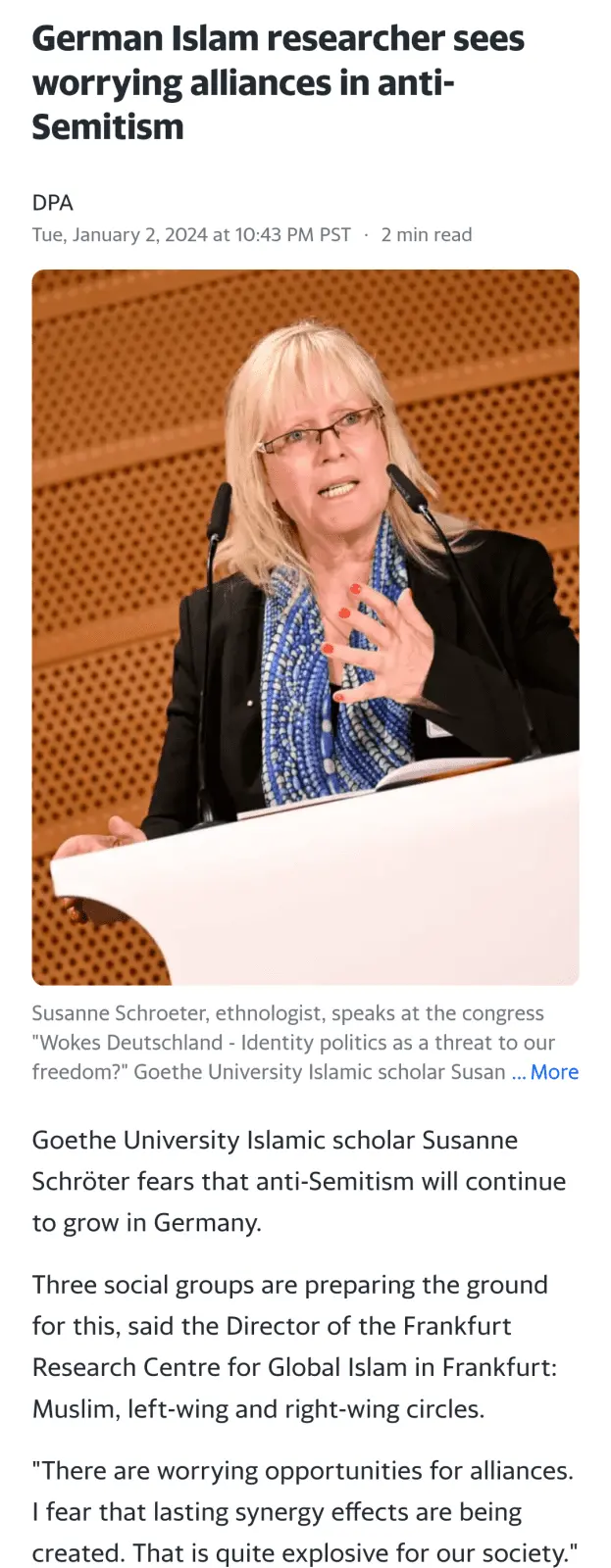 ...This false but powerful construction can be directly linked to Islamist narratives," and this attitude is also compatible with right-wing narratives, said Schröter.