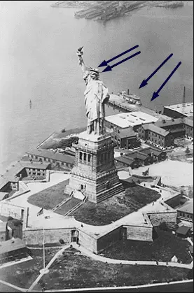 I have placed arrows for the pier to Black Tom Island and also placed arrows for the crown of The Statue of Liberty: