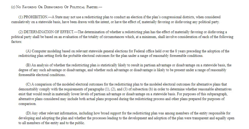It says specifically ANY districts that are drawn with the purpose of favoring a political party or disfavoring a political party is illegal no matter when. Its not some trick. It was a real bill to end gerrymandering.All that says, in so much DC gibberish, is things will be "considered" - there is no detonation or willing surrender of gerrymandered blue districts.