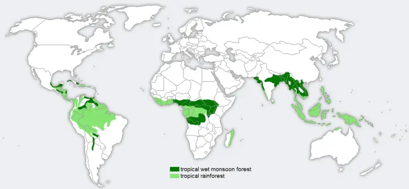 Jungles of the world. Mostly around the equator, but some places have jungle much further away, other places, like east Africa have no jingle except on the east coast of Madagascar.