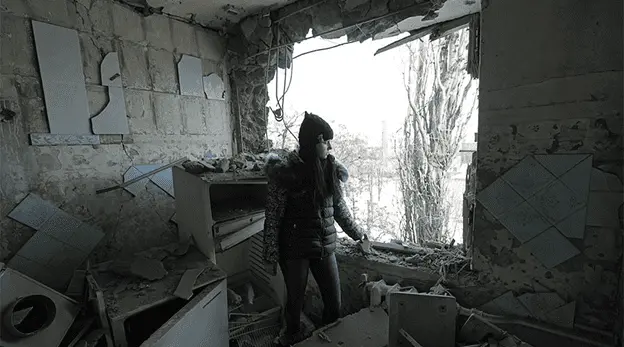 Civilian resident of Donetsk in her home destroyed by shelling.
