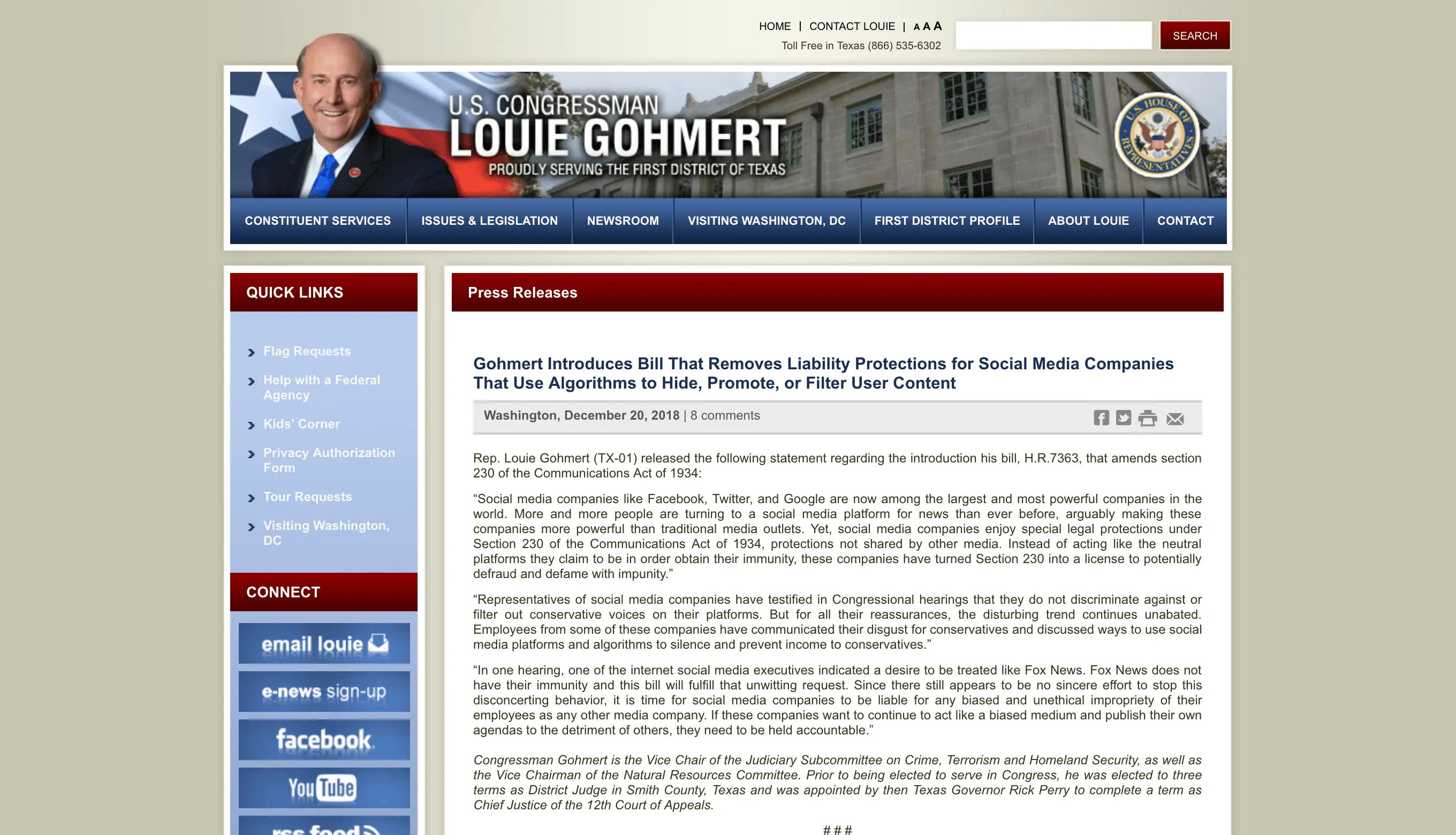 From Gohmert.house.gov, “Gohmert Introduces Bill That Removes Liability Protections for Social Media Companies That Use Algorithms to Hide, Promote, or Filter User Content”:
