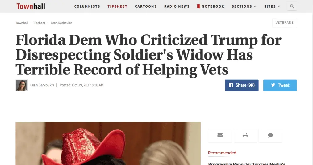 It turns out the Florida Democrat who criticized President Trump this week for making insensitive remarks toward the widow of a fallen U.S. soldier doesn’t exactly have a great track record herself when it comes to helping veterans.