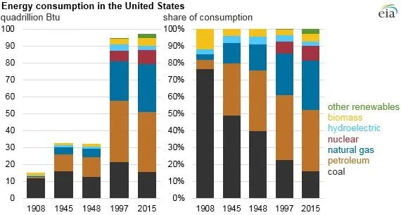 Reality check: In 1908, fossil fuels accounted for 85% of U.S. energy consumption. In 2015, more or less the same