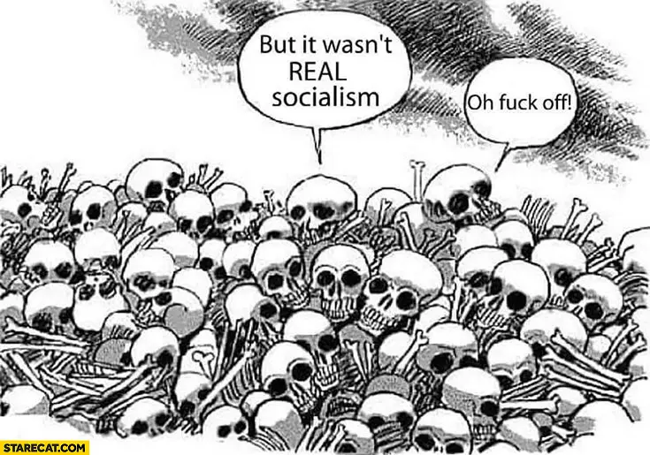1. In this video, this girl says that the reason socialism has never worked, is because it has never been done correctly. She is not at all concerned that socialism has never been successful or even implemented at any time in history. Somehow, they will figure out a way to do it right after all these centuries that it has been attempted and failed. You then go down the path of a "No True Scotsmen" arguments. Hilarious. In fact, they avoid the horrific results from socialism having failed in the past, to the tune of hundreds of millions of people dying from such attempts.