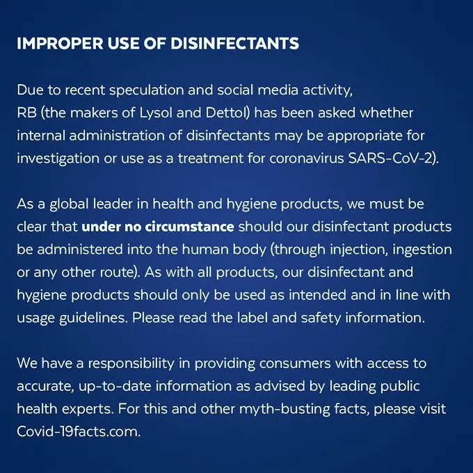 They should have made the language in this statement a lot simpler, and put Para 2 first. These people are forgetting the audience they are trying to reach--the people who would consider chugging bleach to cure the Virus.