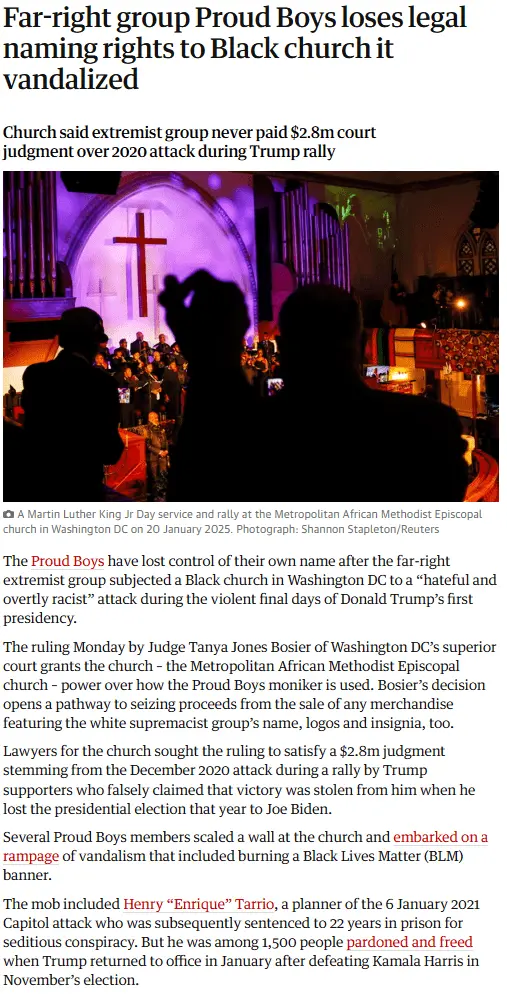 Far-right group Proud Boys loses legal naming rights to Black church it vandalized