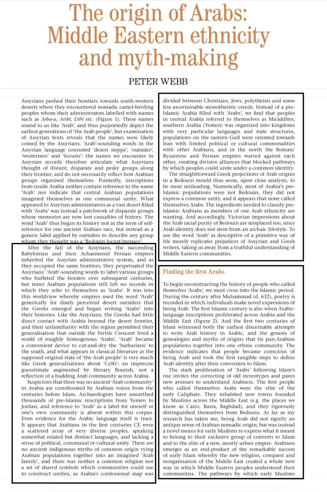 The stark proliferation of 'Arabs' following Islam's rise invites the correcting of old stereotypes and paves new avenues to understand Arabness. The first people who called themselves Arabs were the elite of the early Caliphate. They inhabited new towns founded by Muslims across the Middle East (e.g. the places we know as Cairo, Basra, Baghdad), and they rigorously distinguished themselves from Bedouin. As far as my research has taken me, being Arab did not signify an antique sense of Arabian nomadic origin, but was instead a novel means for early Muslims to express what it meant to belong to their exclusive group of converts to Islam and to the elite of a new, mostly urban empire. Arabness emerges as an end-product of the remarkable success of early Islam whereby the new religion, conquest and reorganisation of the Middle East created a whole new way in which Middle Eastern peoples understood their communities.”